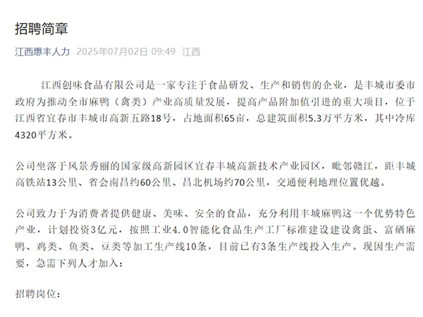 江西創(chuàng)味食品有限公司是一家專注于食品研發(fā)、生產(chǎn)和銷售的企業(yè),是豐城市委市政府為推動(dòng)全市麻鴨(禽類)產(chǎn)業(yè)高質(zhì)量發(fā)展,提高產(chǎn)品附加值引進(jìn)的重大項(xiàng)目,位于江西省宜春市...
